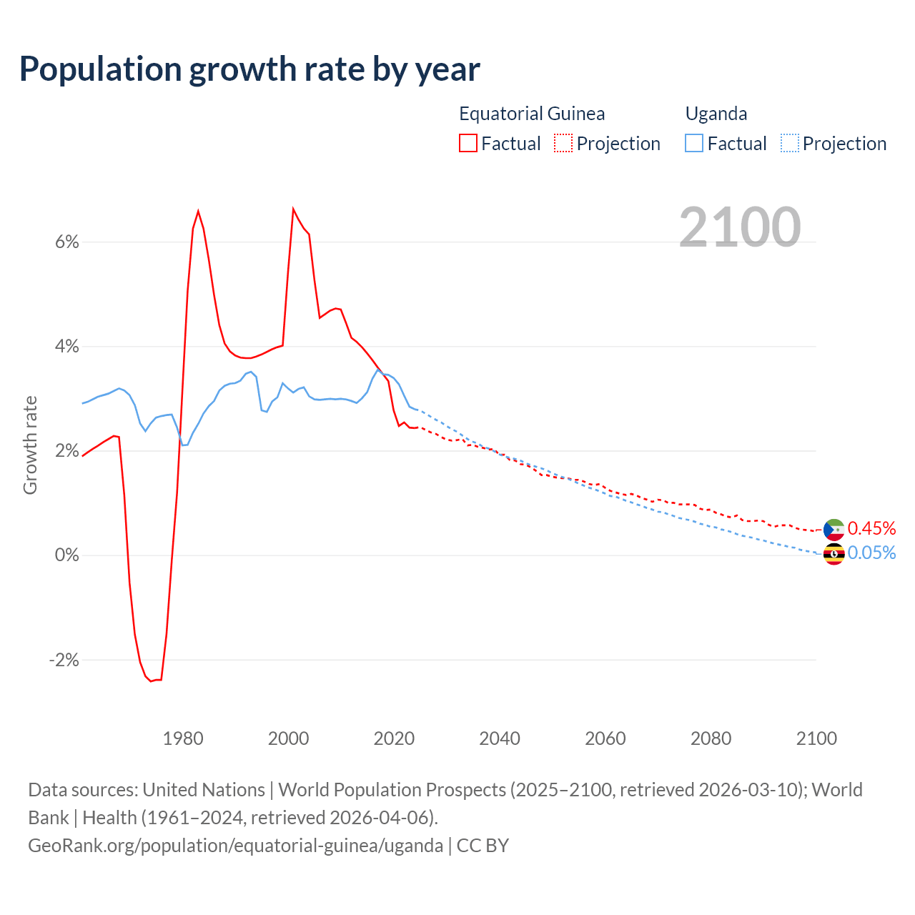 Equatorial Guinea vs Uganda: population by year and forecast