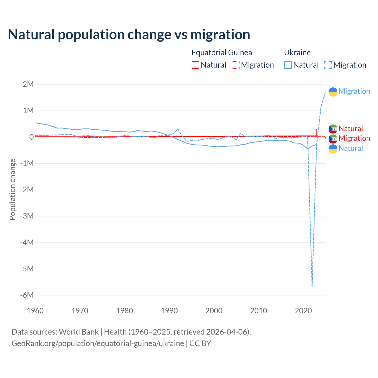 Over the last 10 years, 77% of the population change in Equatorial Guinea is from natural causes (a gain of 382,745 people) and 23% is from migration (a gain of 114,024 people). In Ukraine 28.2% is from natural causes (a loss of 2,435,153 people) and 71.8% is from migration (a loss of 6,198,995 people).