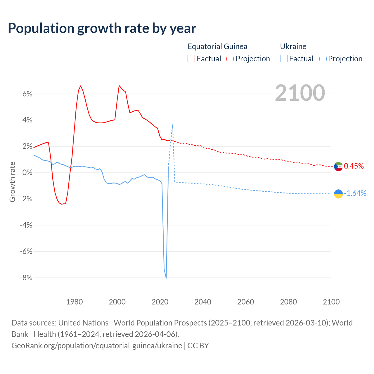 - For the last 10 years, Equatorial Guinea has had an average growth rate of +3.15% per year vs -1.74% in Ukraine.