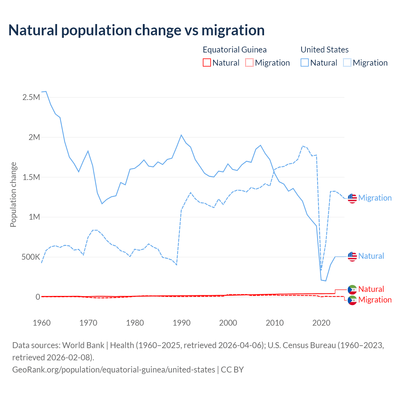 Over the last 10 years, 77% of the population change in Equatorial Guinea is from natural causes (a gain of 382,745 people) and 23% is from migration (a gain of 114,024 people). In the United States 35.8% is from natural causes (a gain of 8,005,866 people) and 64.2% is from migration (a gain of 14,334,286 people).