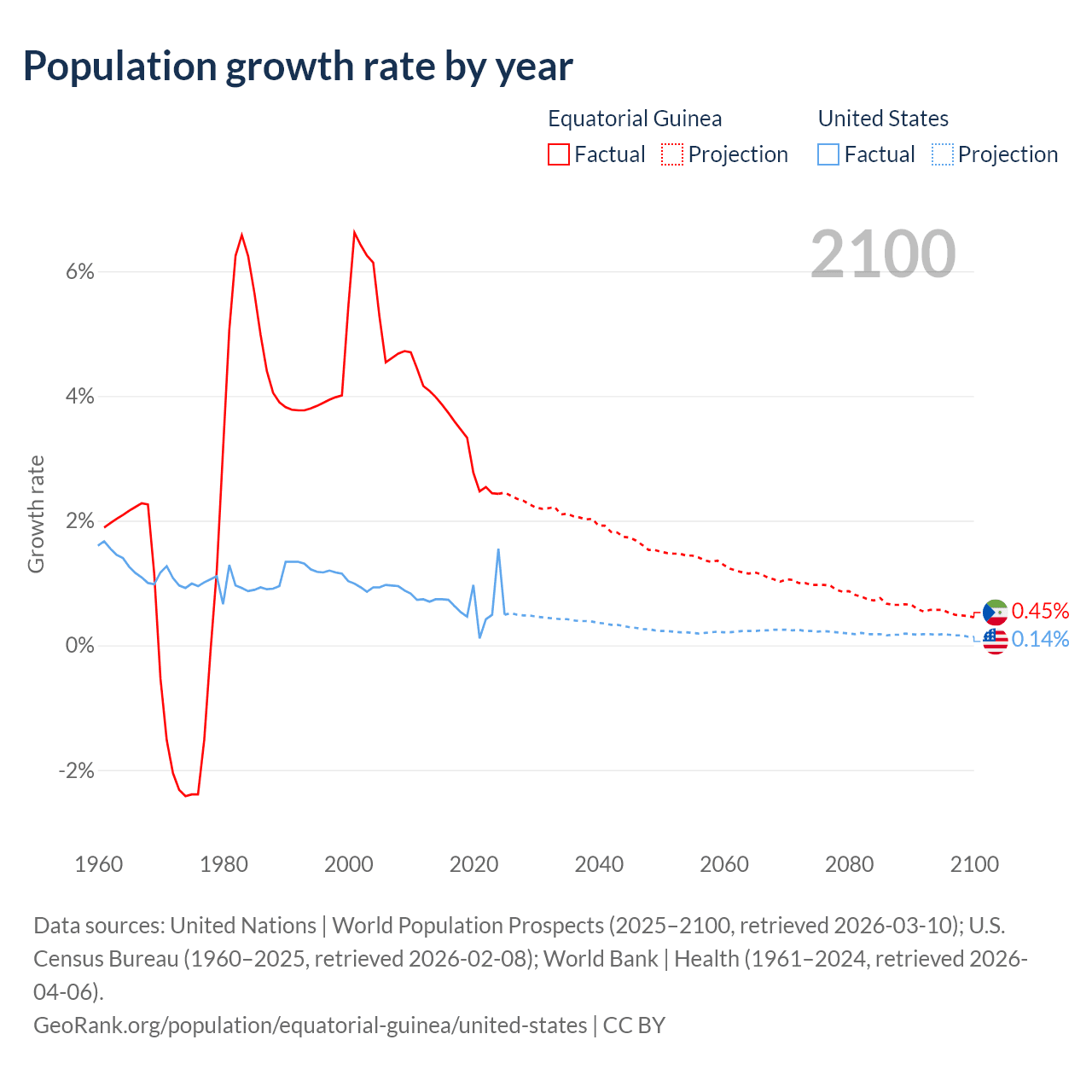 - For the last 10 years, Equatorial Guinea has had an average growth rate of +3.15% per year vs +0.65% in the United States.