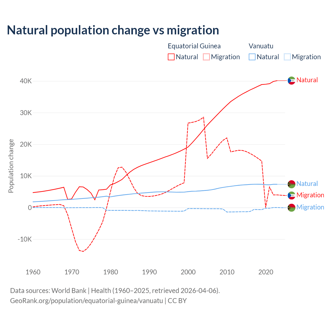 Over the last 10 years, 77% of the population change in Equatorial Guinea is from natural causes (a gain of 382,745 people) and 23% is from migration (a gain of 114,024 people). In Vanuatu 92.2% is from natural causes (a gain of 72,941 people) and 7.81% is from migration (a loss of 6,181 people).