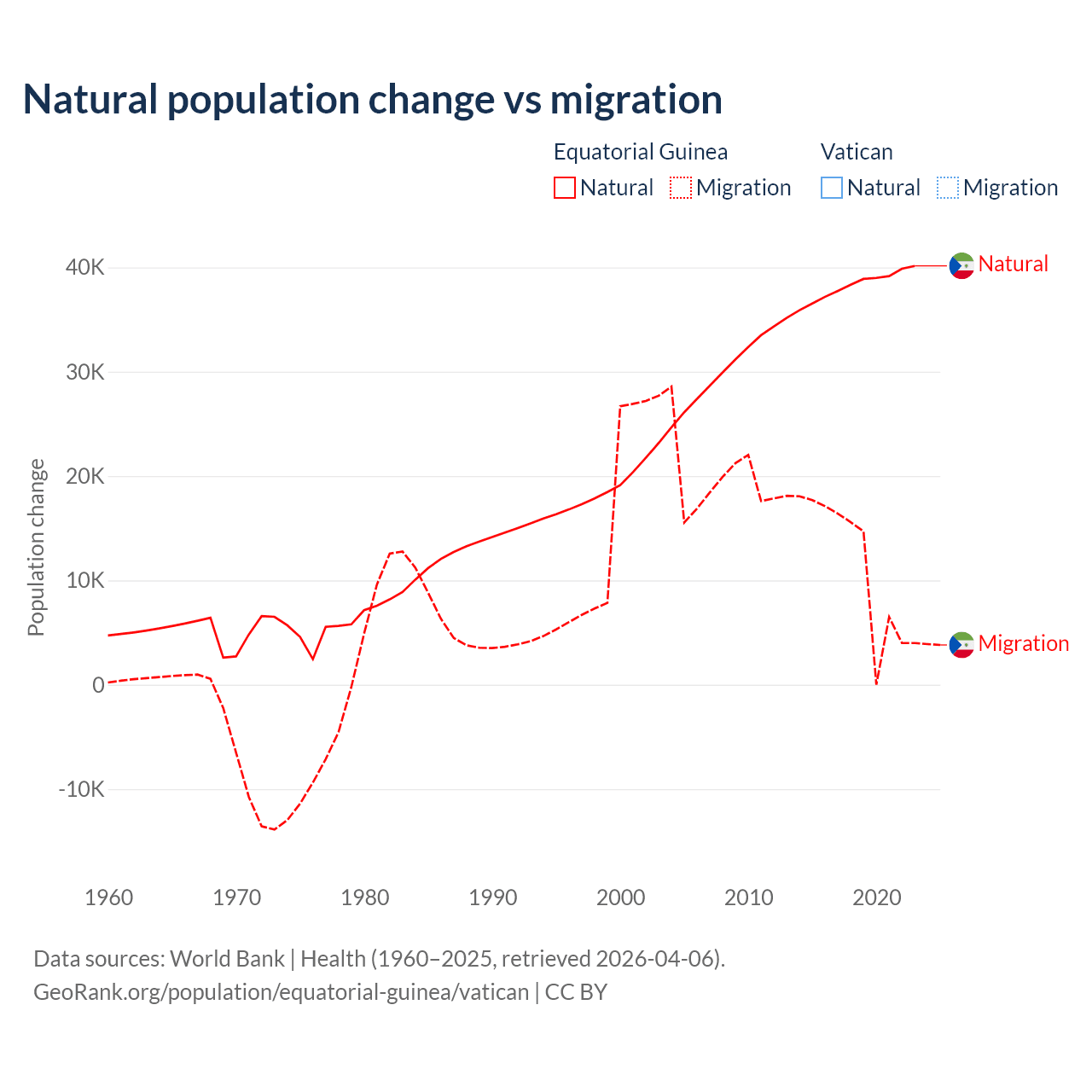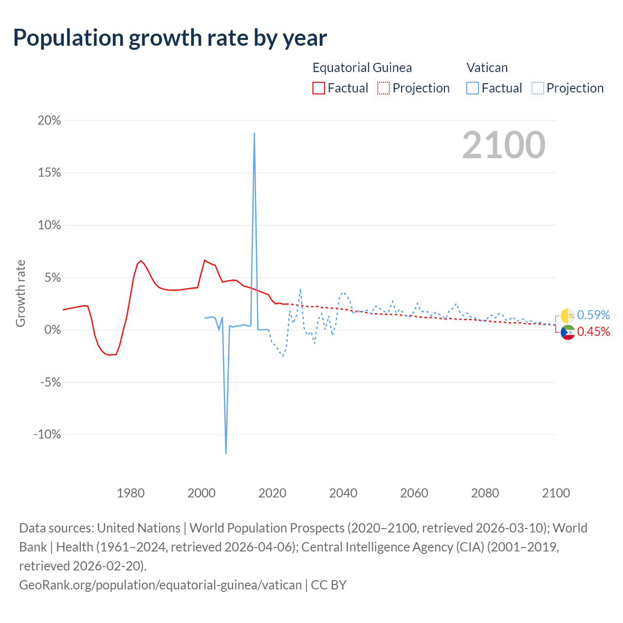 - For the last 10 years, Equatorial Guinea has had an average growth rate of +3.15% per year vs +1.9% in the Vatican.