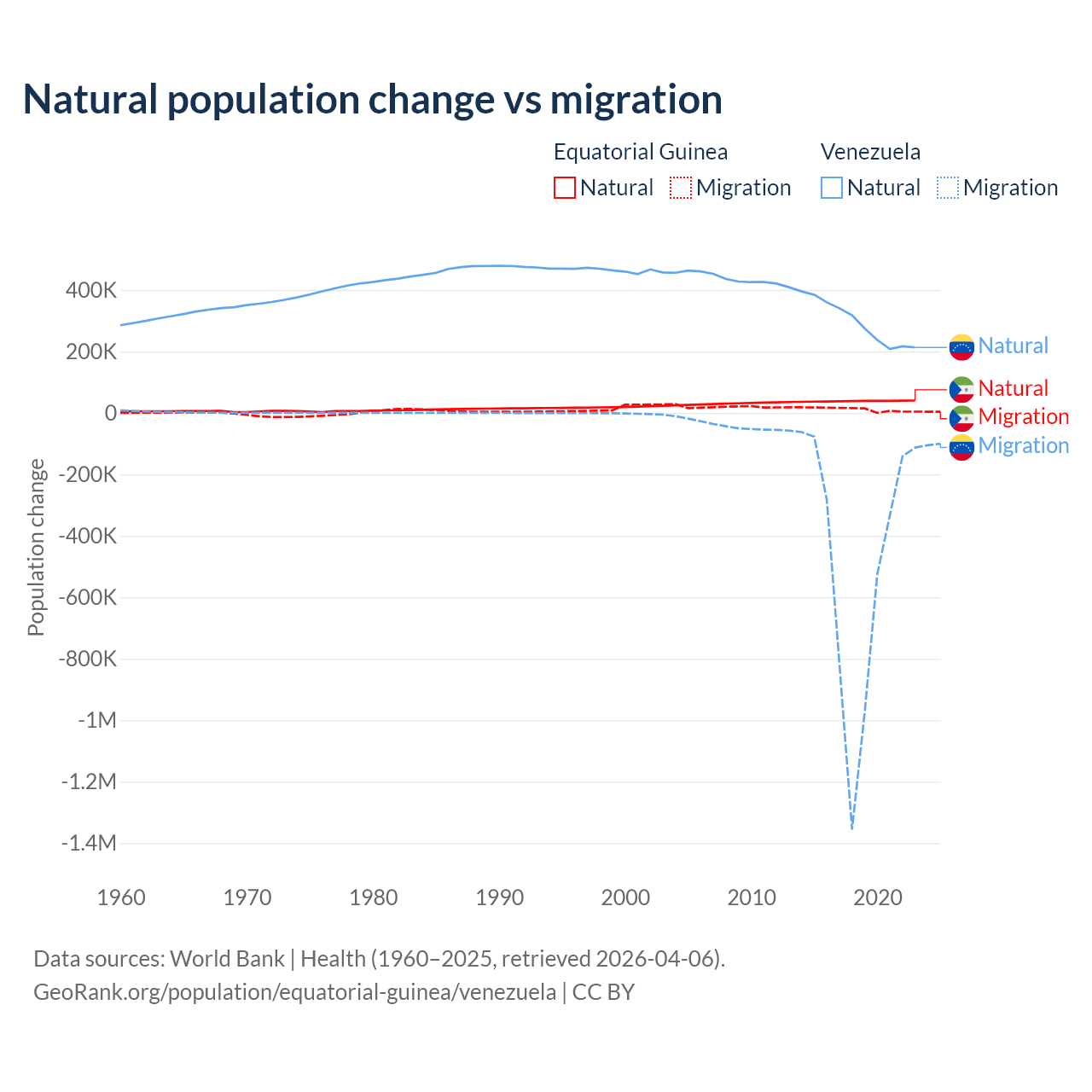 Over the last 10 years, 77% of the population change in Equatorial Guinea is from natural causes (a gain of 382,745 people) and 23% is from migration (a gain of 114,024 people). In Venezuela 38.6% is from natural causes (a gain of 2,946,257 people) and 61.4% is from migration (a loss of 4,683,227 people).
