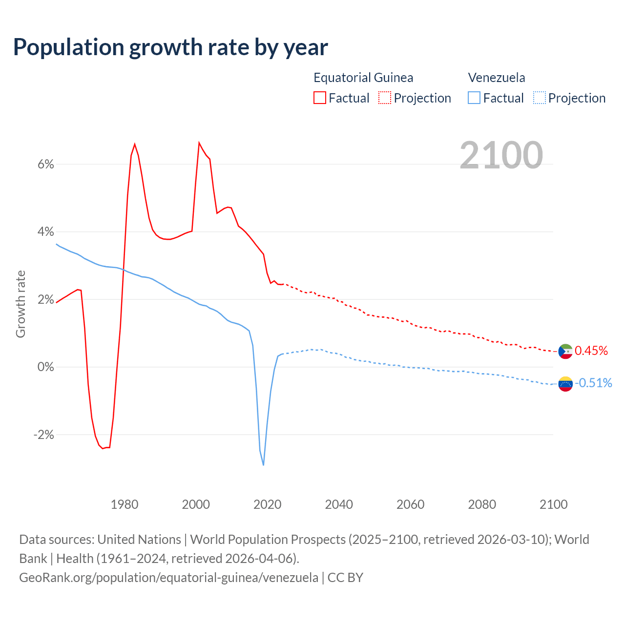 - For the last 10 years, Equatorial Guinea has had an average growth rate of +3.15% per year vs -0.46% in Venezuela.
