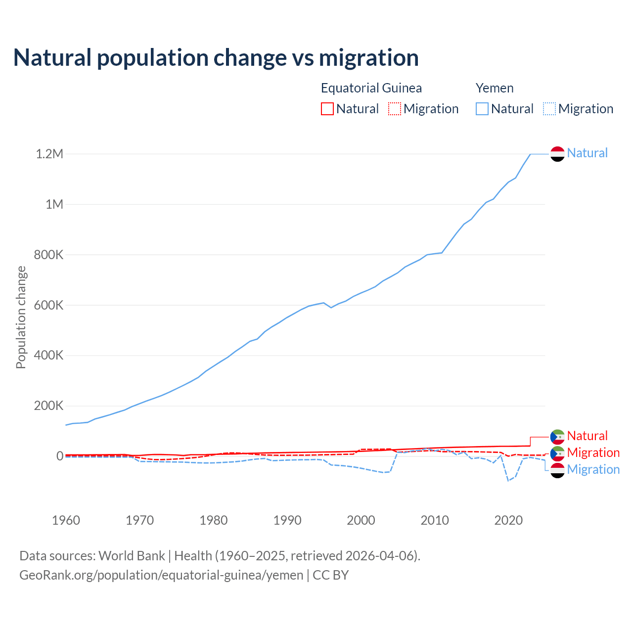 Over the last 10 years, 77% of the population change in Equatorial Guinea is from natural causes (a gain of 382,745 people) and 23% is from migration (a gain of 114,024 people). In Yemen 97.8% is from natural causes (a gain of 10,460,813 people) and 2.17% is from migration (a loss of 231,814 people).
