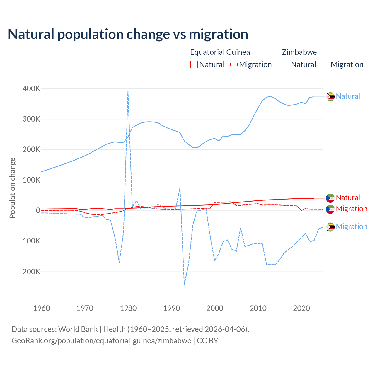 Over the last 10 years, 77% of the population change in Equatorial Guinea is from natural causes (a gain of 382,745 people) and 23% is from migration (a gain of 114,024 people). In Zimbabwe 74.9% is from natural causes (a gain of 3,558,487 people) and 25.1% is from migration (a loss of 1,192,807 people).