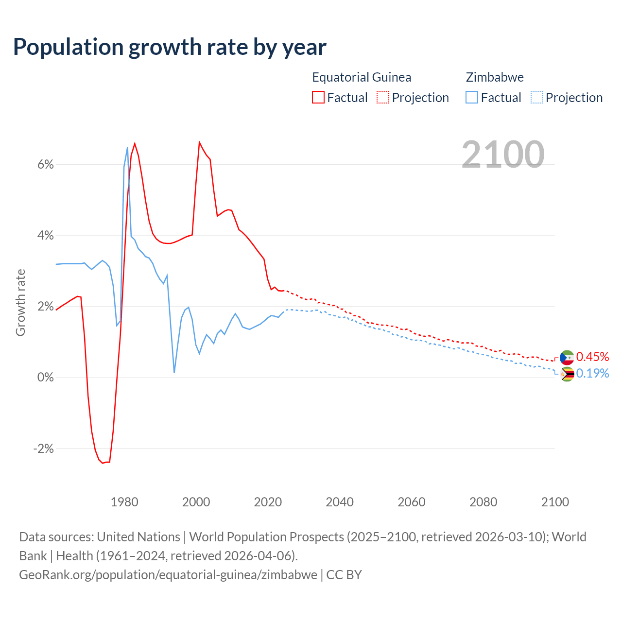 - For the last 10 years, Equatorial Guinea has had an average growth rate of +3.15% per year vs +1.57% in Zimbabwe.