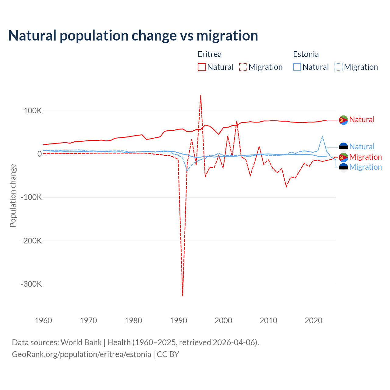 Over the last 10 years, 68.8% of the population change in Eritrea is from natural causes (a gain of 742,837 people) and 31.2% is from migration (a loss of 336,243 people). In Estonia 26.1% is from natural causes (a loss of 27,683 people) and 73.9% is from migration (a gain of 78,553 people).