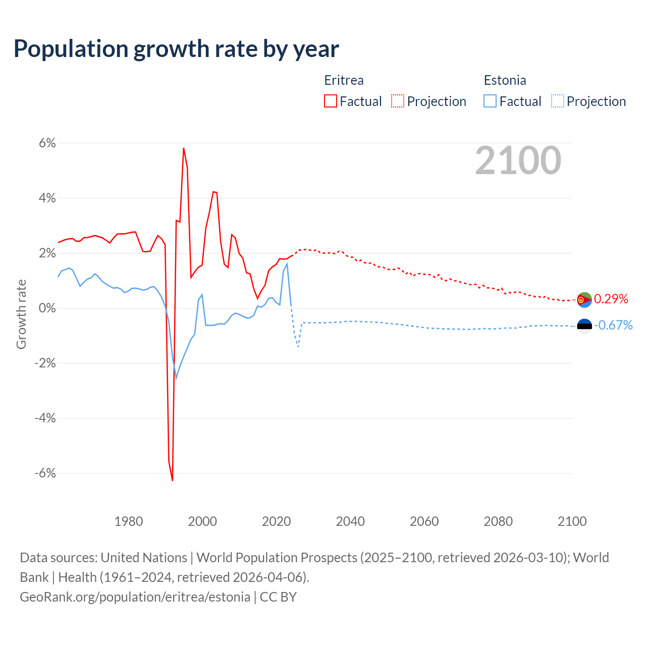 - For the last 10 years, Eritrea has had an average growth rate of +1.28% per year vs +0.37% in Estonia.