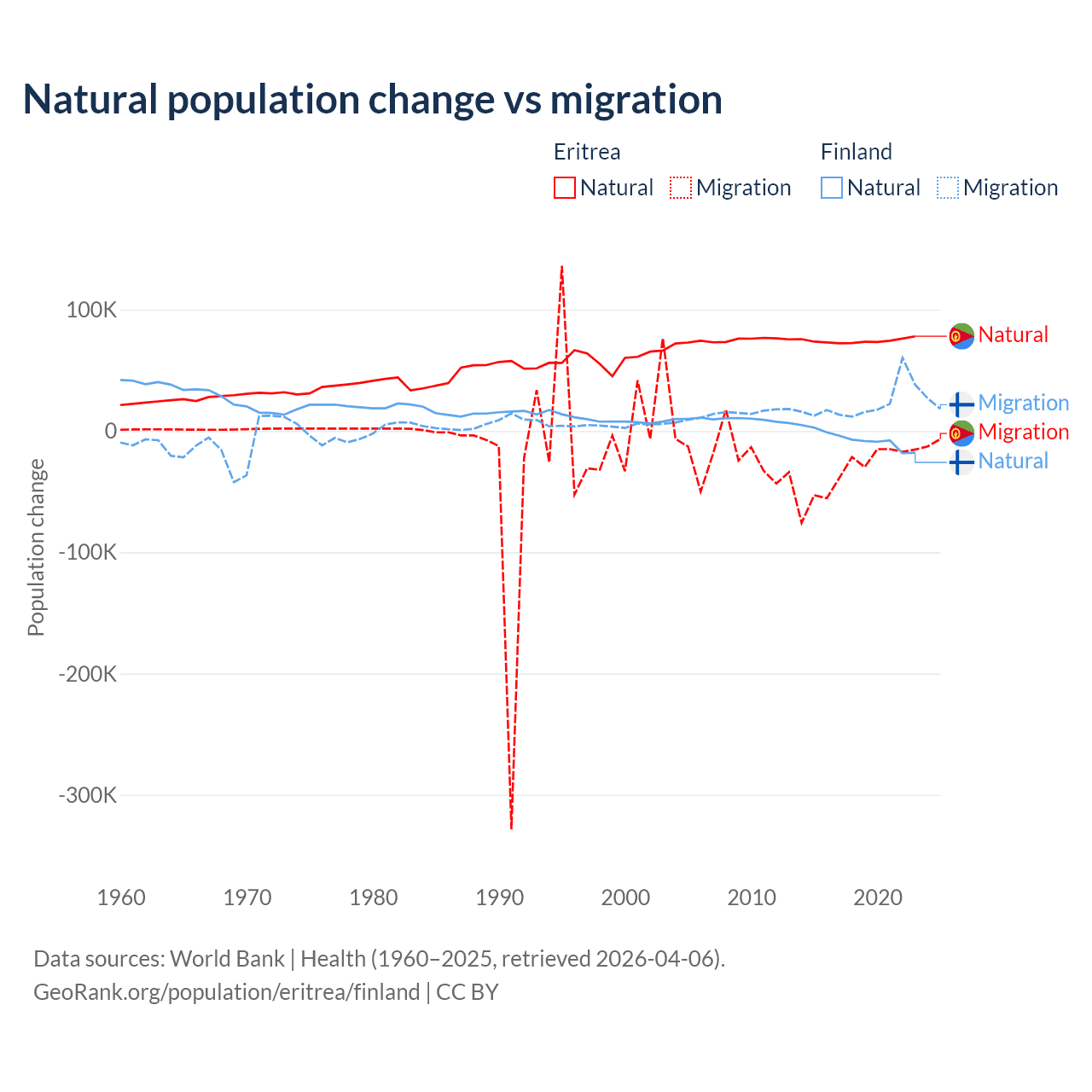 Over the last 10 years, 68.8% of the population change in Eritrea is from natural causes (a gain of 742,837 people) and 31.2% is from migration (a loss of 336,243 people). In Finland 22.5% is from natural causes (a loss of 65,560 people) and 77.5% is from migration (a gain of 225,237 people).