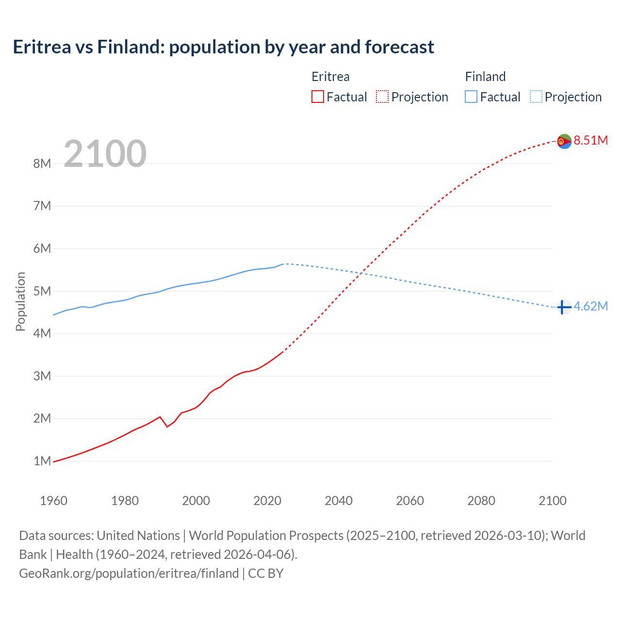 The latest officially reported population of Eritrea was 3,535,603 in 2024 vs 5,619,911 people in Finland in 2024. In 2026, based on the adjusted UN estimation, the current Eritrea's population is 3,700,586 people compared to 5,631,965 in Finland.
