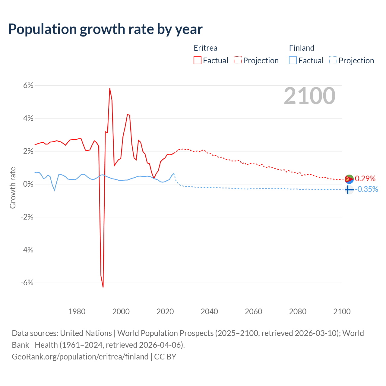 - For the last 10 years, Eritrea has had an average growth rate of +1.28% per year vs +0.3% in Finland.