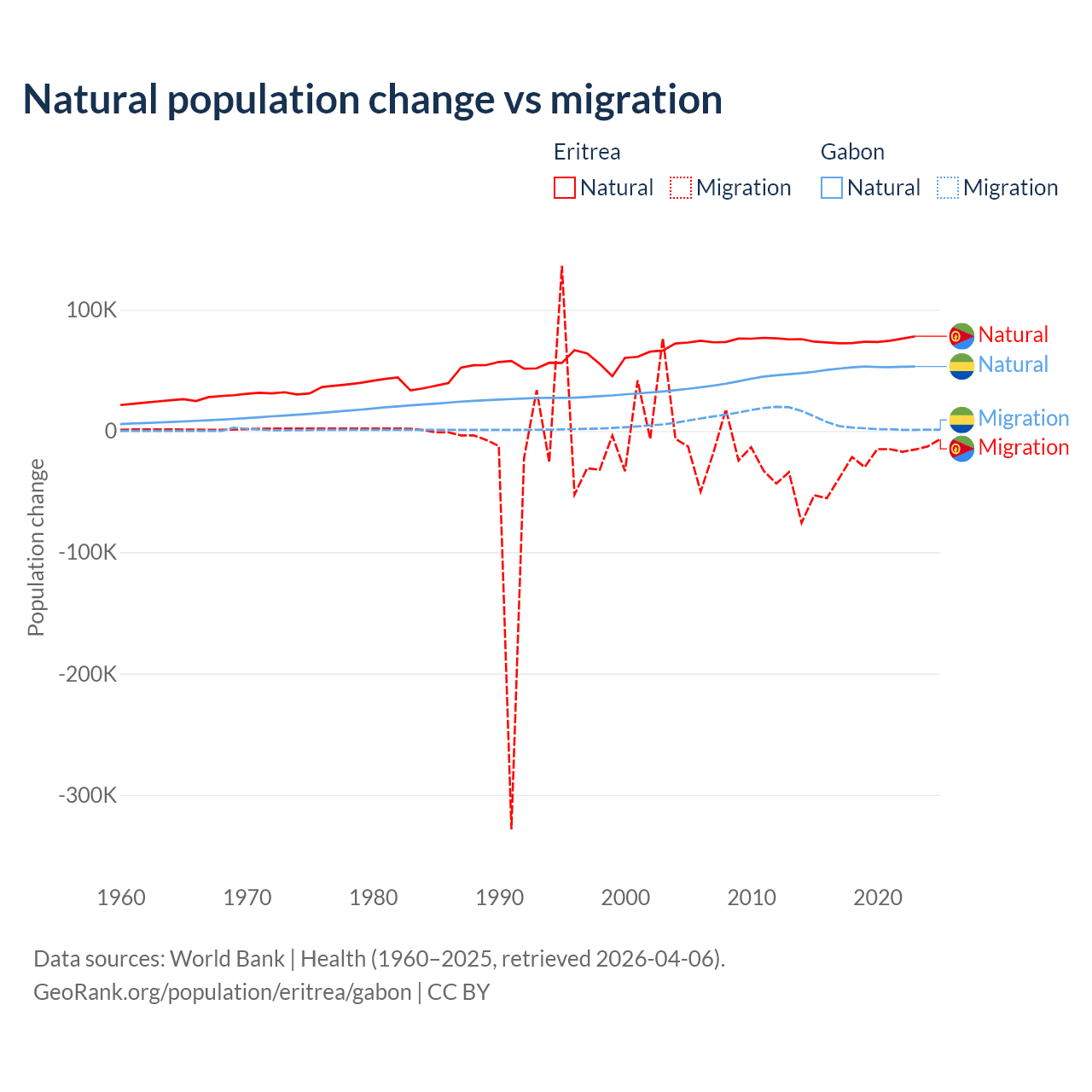 Over the last 10 years, 68.8% of the population change in Eritrea is from natural causes (a gain of 742,837 people) and 31.2% is from migration (a loss of 336,243 people). In Gabon 91.1% is from natural causes (a gain of 515,484 people) and 8.86% is from migration (a gain of 50,119 people).