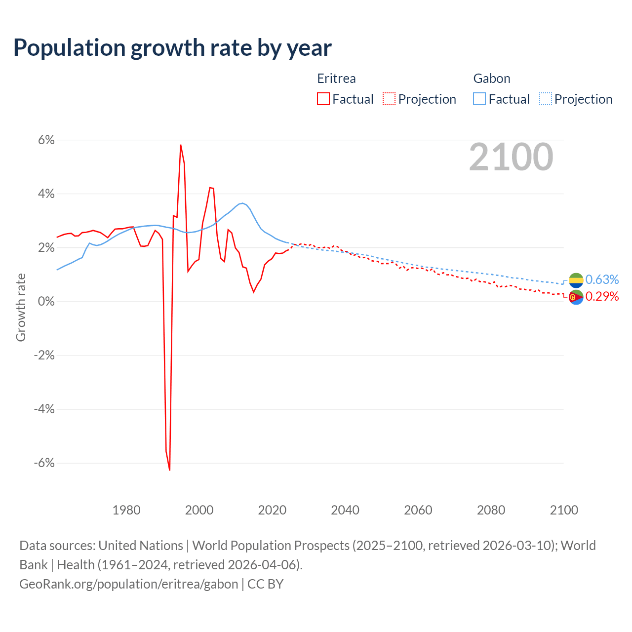 - For the last 10 years, Eritrea has had an average growth rate of +1.28% per year vs +2.61% in Gabon.