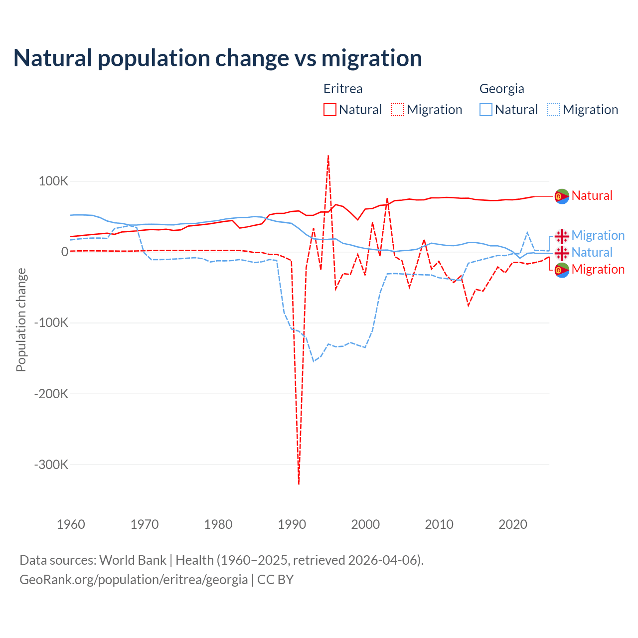 Over the last 10 years, 68.8% of the population change in Eritrea is from natural causes (a gain of 742,837 people) and 31.2% is from migration (a loss of 336,243 people). In Georgia 57.7% is from natural causes (a gain of 47,646 people) and 42.3% is from migration (a loss of 34,907 people).