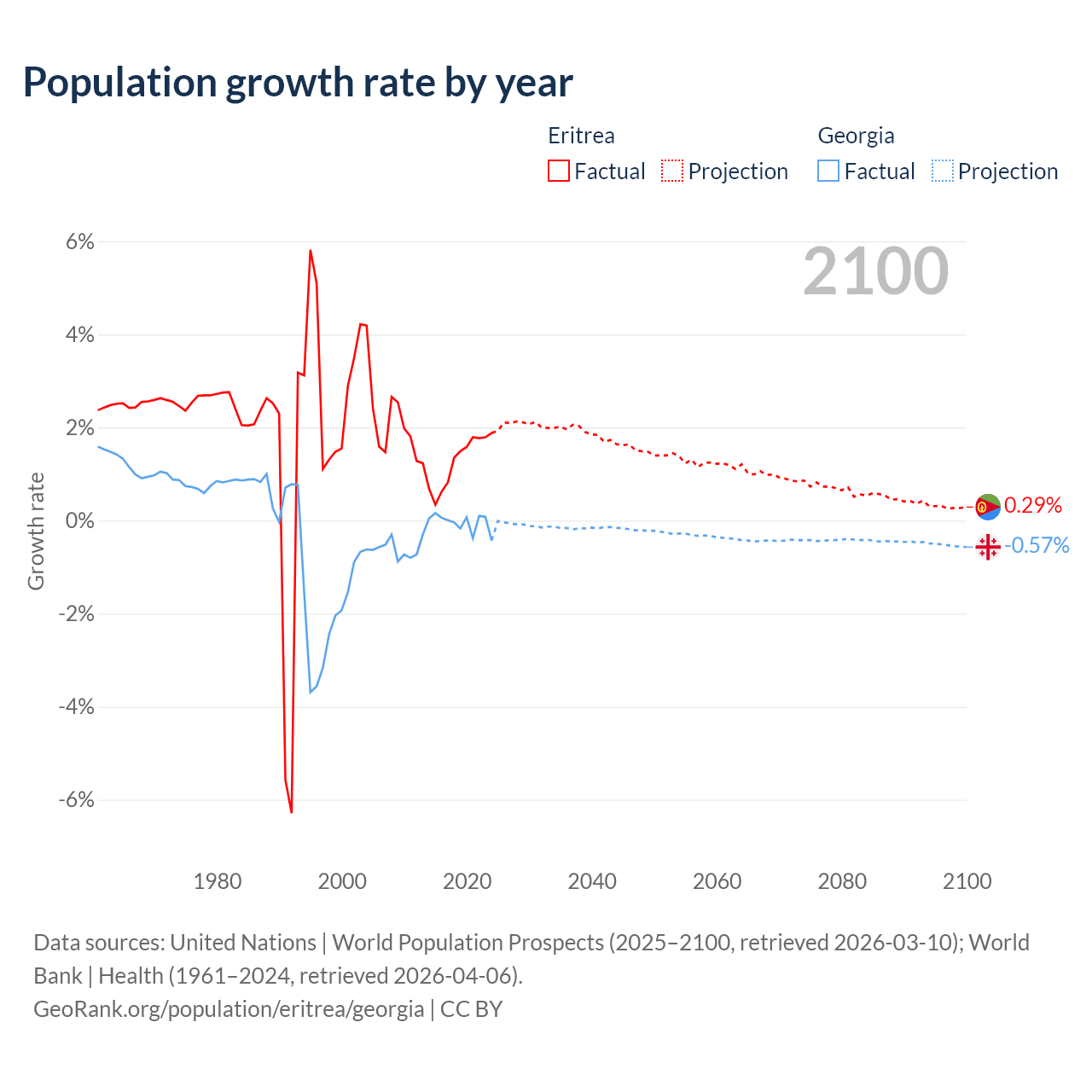 - For the last 10 years, Eritrea has had an average growth rate of +1.28% per year vs -0.04% in Georgia.