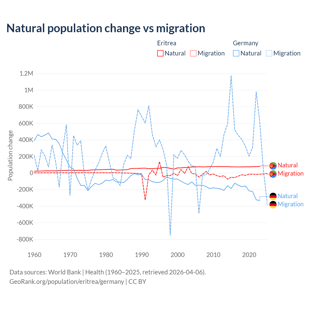 Over the last 10 years, 68.8% of the population change in Eritrea is from natural causes (a gain of 742,837 people) and 31.2% is from migration (a loss of 336,243 people). In Germany 26.8% is from natural causes (a loss of 2,036,130 people) and 73.2% is from migration (a gain of 5,565,916 people).