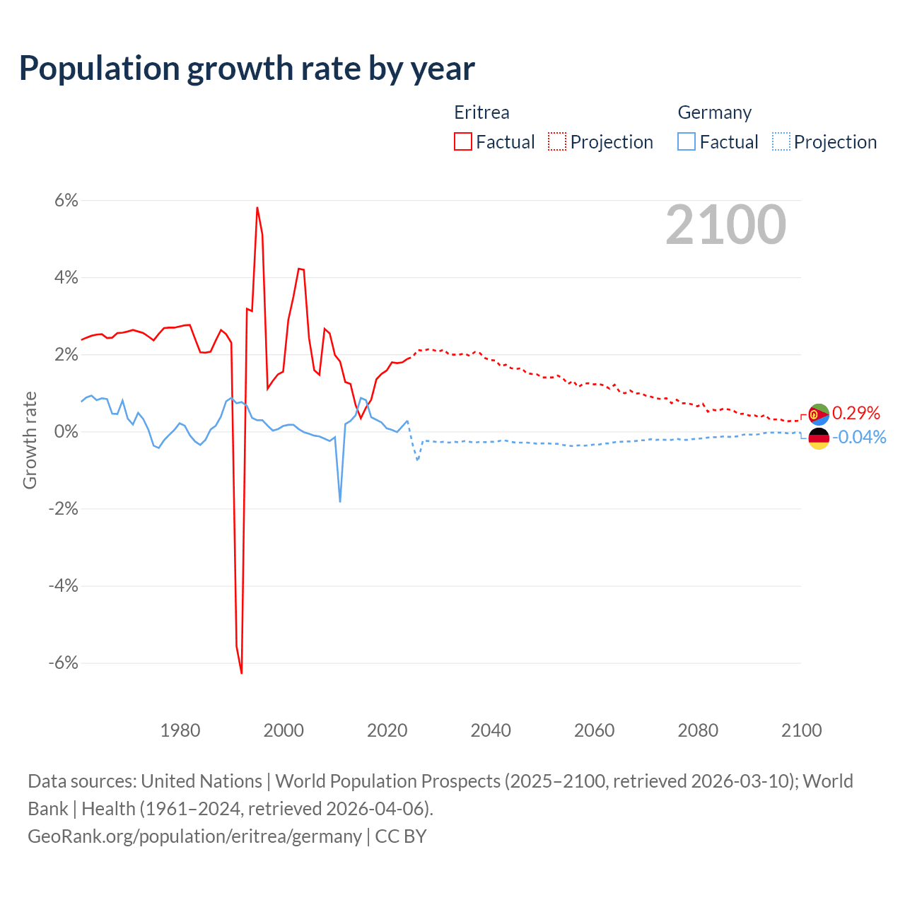 - For the last 10 years, Eritrea has had an average growth rate of +1.28% per year vs +0.32% in Germany.
