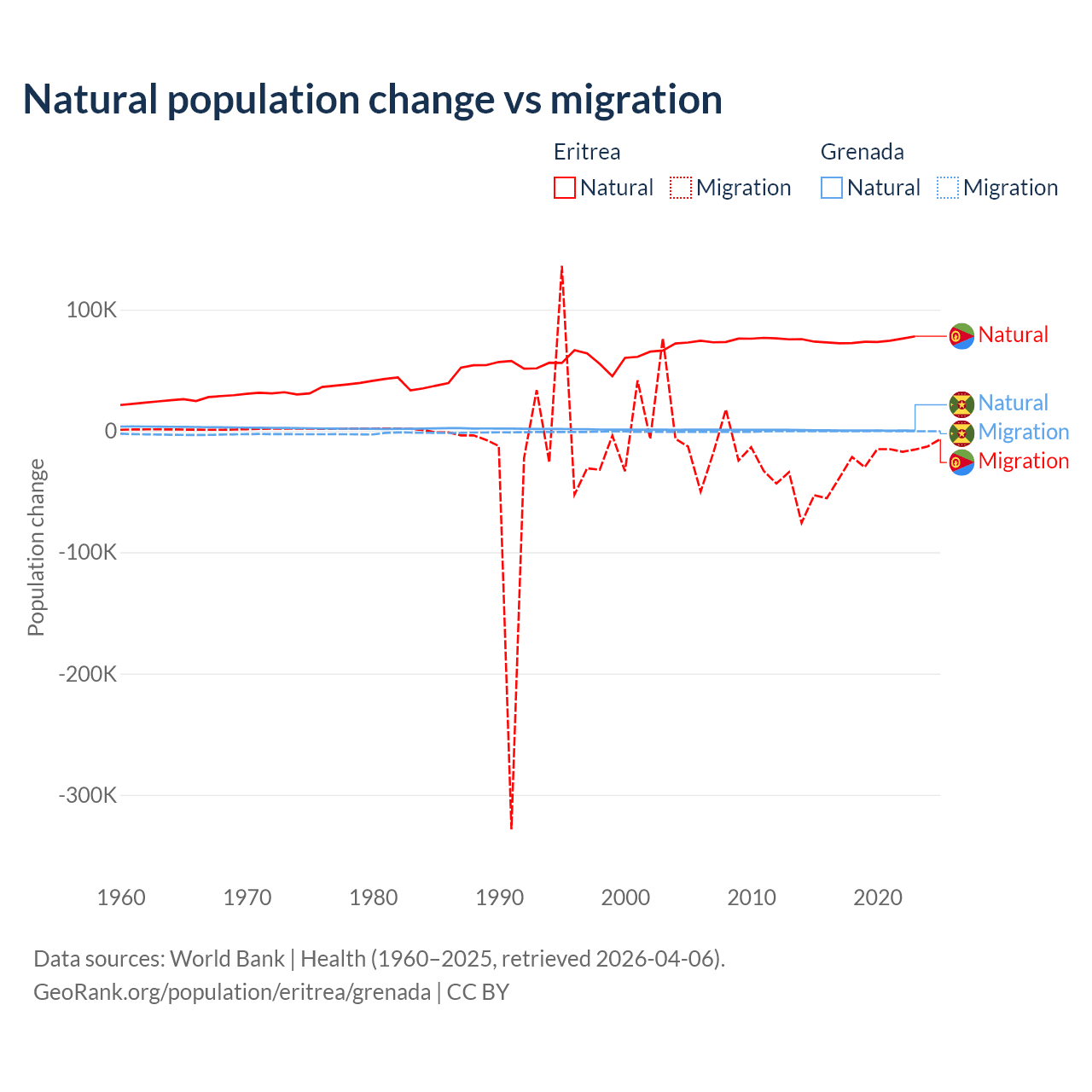 Over the last 10 years, 68.8% of the population change in Eritrea is from natural causes (a gain of 742,837 people) and 31.2% is from migration (a loss of 336,243 people). In Grenada 76% is from natural causes (a gain of 4,850 people) and 24% is from migration (a loss of 1,535 people).