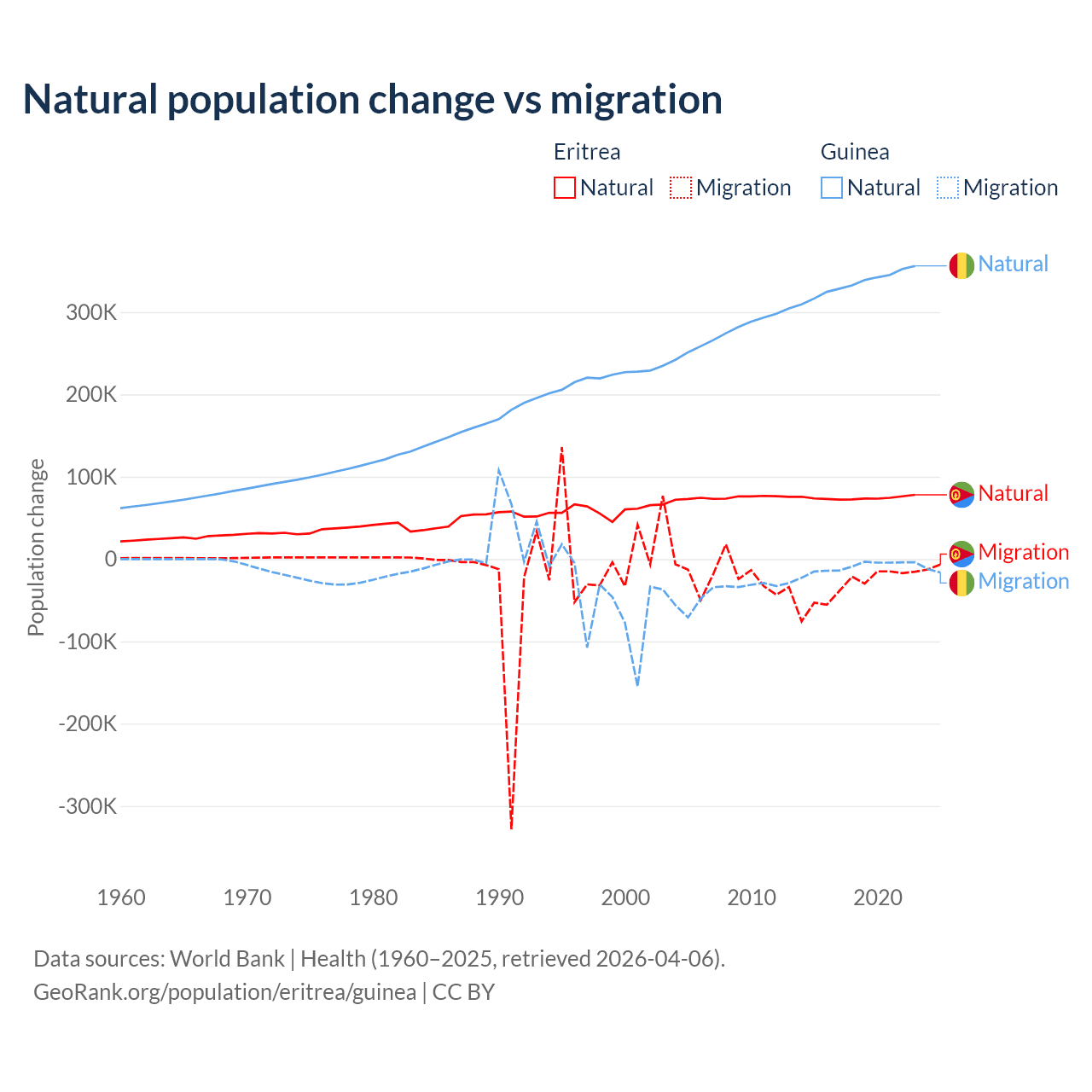 Over the last 10 years, 68.8% of the population change in Eritrea is from natural causes (a gain of 742,837 people) and 31.2% is from migration (a loss of 336,243 people). In Guinea 97.2% is from natural causes (a gain of 3,346,936 people) and 2.76% is from migration (a loss of 94,924 people).