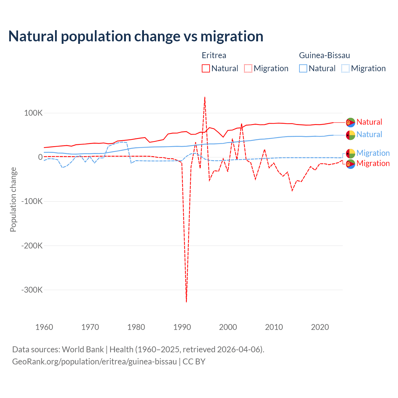 Over the last 10 years, 68.8% of the population change in Eritrea is from natural causes (a gain of 742,837 people) and 31.2% is from migration (a loss of 336,243 people). In Guinea-Bissau 97.1% is from natural causes (a gain of 472,826 people) and 2.87% is from migration (a loss of 13,956 people).