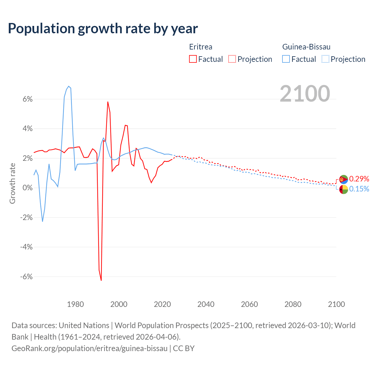 - For the last 10 years, Eritrea has had an average growth rate of +1.28% per year vs +2.4% in Guinea-Bissau.