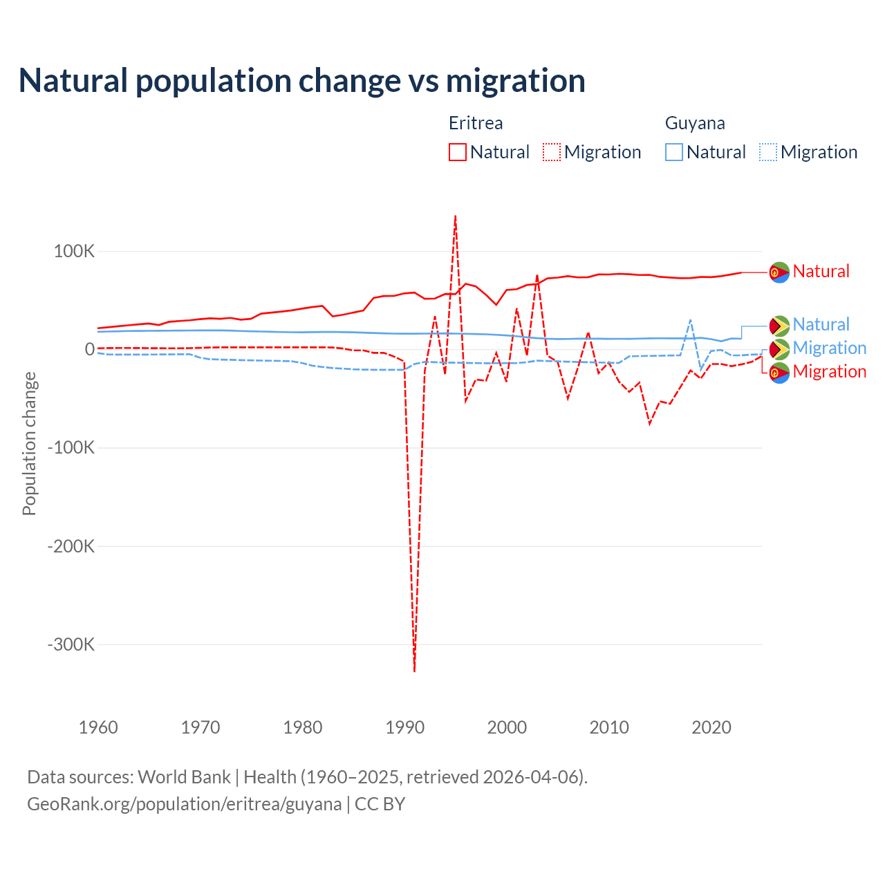 Over the last 10 years, 68.8% of the population change in Eritrea is from natural causes (a gain of 742,837 people) and 31.2% is from migration (a loss of 336,243 people). In Guyana 77.7% is from natural causes (a gain of 107,419 people) and 22.3% is from migration (a loss of 30,797 people).