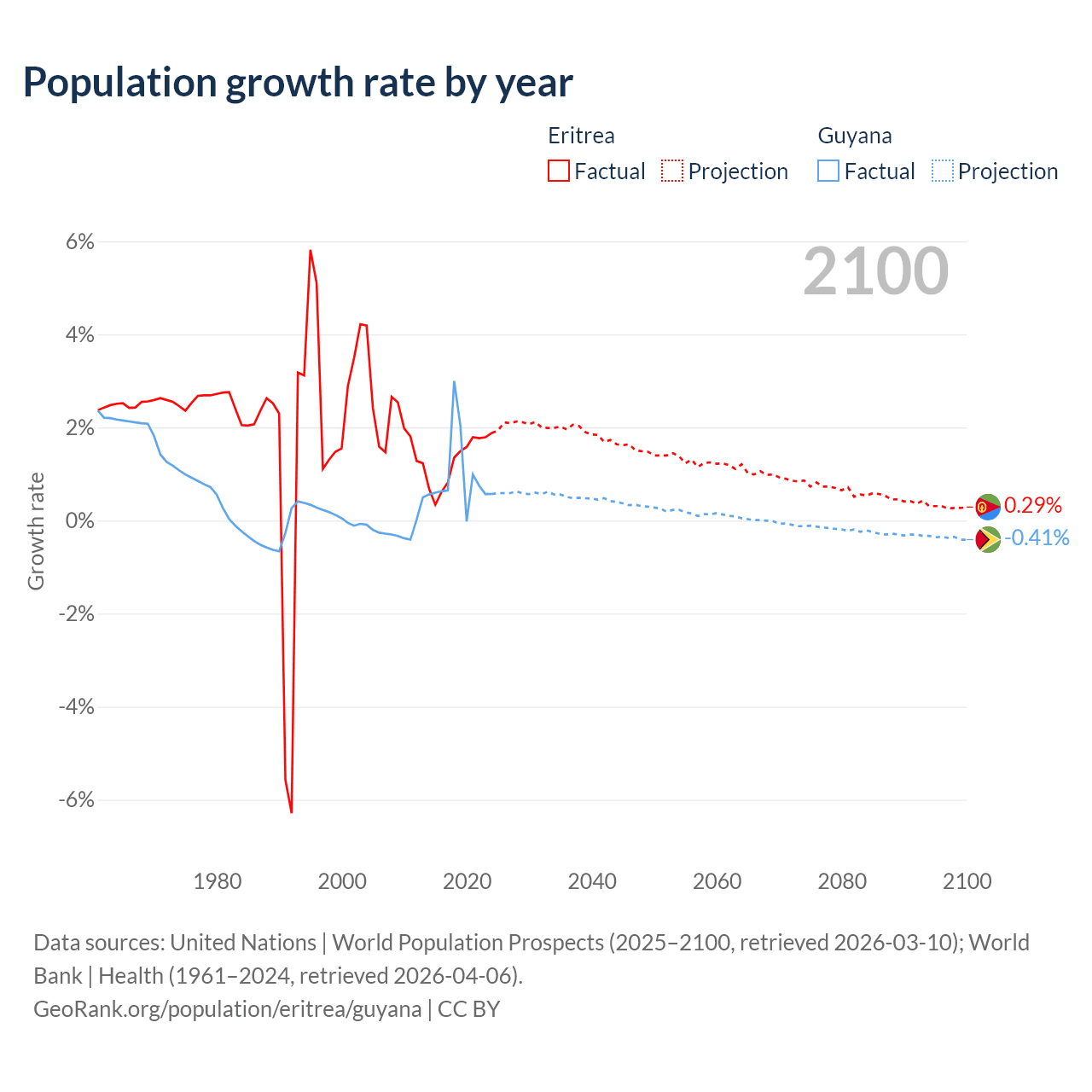 - For the last 10 years, Eritrea has had an average growth rate of +1.28% per year vs +0.94% in Guyana.