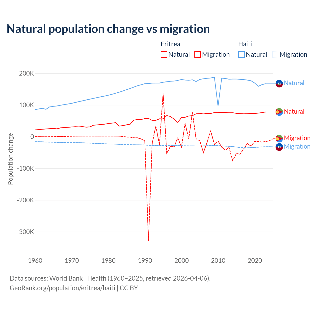 Over the last 10 years, 68.8% of the population change in Eritrea is from natural causes (a gain of 742,837 people) and 31.2% is from migration (a loss of 336,243 people). In Haiti 83.9% is from natural causes (a gain of 1,740,319 people) and 16.1% is from migration (a loss of 333,076 people).