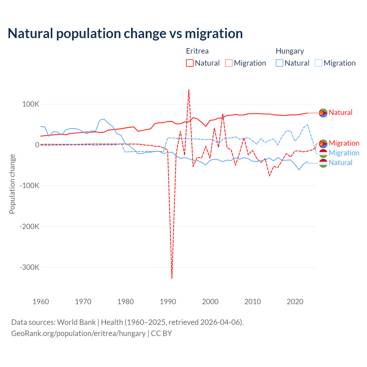 Over the last 10 years, 68.8% of the population change in Eritrea is from natural causes (a gain of 742,837 people) and 31.2% is from migration (a loss of 336,243 people). In Hungary 63.7% is from natural causes (a loss of 412,838 people) and 36.3% is from migration (a gain of 234,837 people).