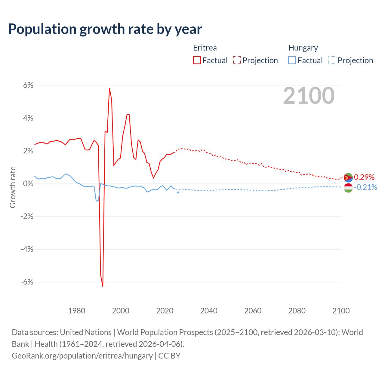 - For the last 10 years, Eritrea has had an average growth rate of +1.28% per year vs -0.29% in Hungary.