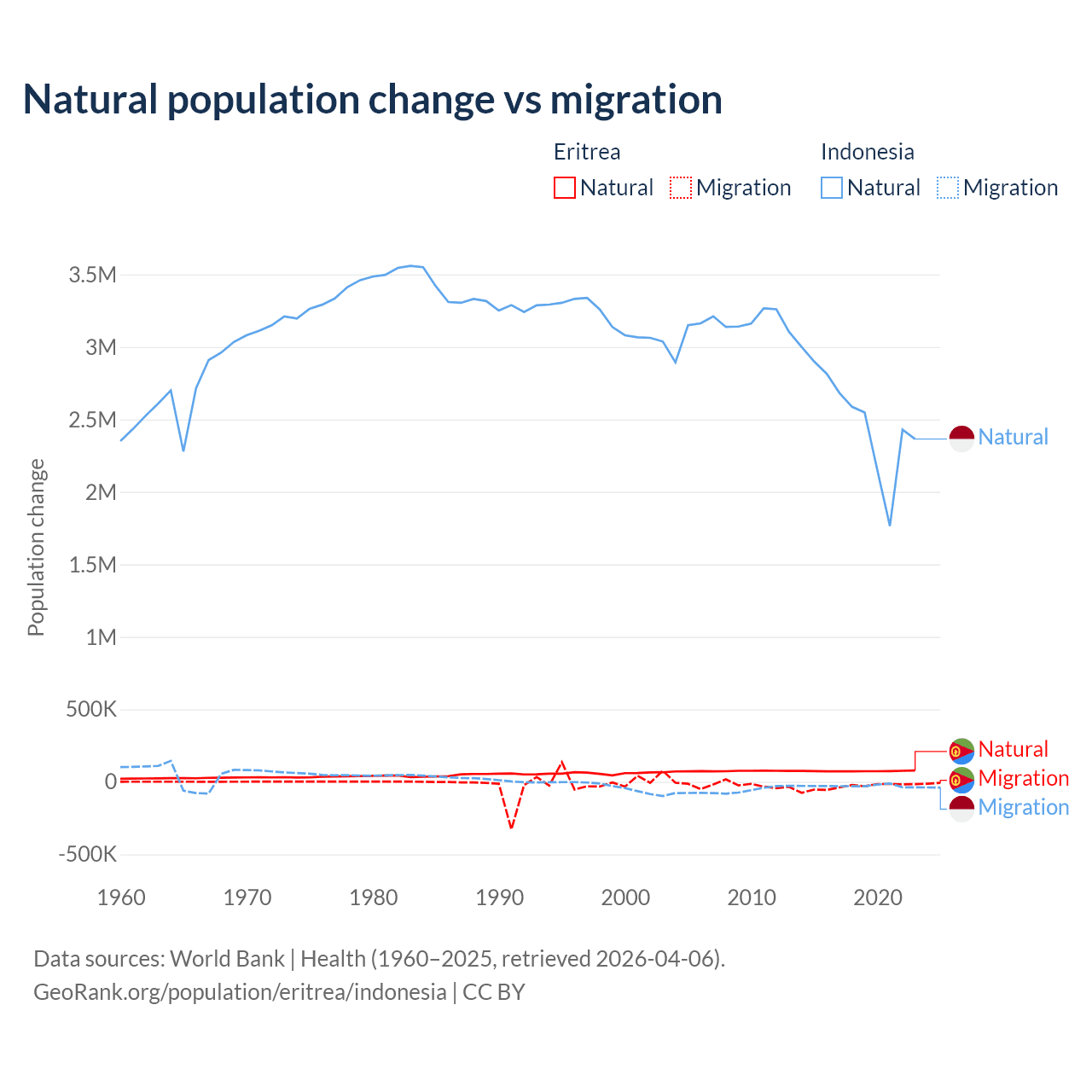 Over the last 10 years, 68.8% of the population change in Eritrea is from natural causes (a gain of 742,837 people) and 31.2% is from migration (a loss of 336,243 people). In Indonesia 98.9% is from natural causes (a gain of 25,242,860 people) and 1.1% is from migration (a loss of 280,258 people).