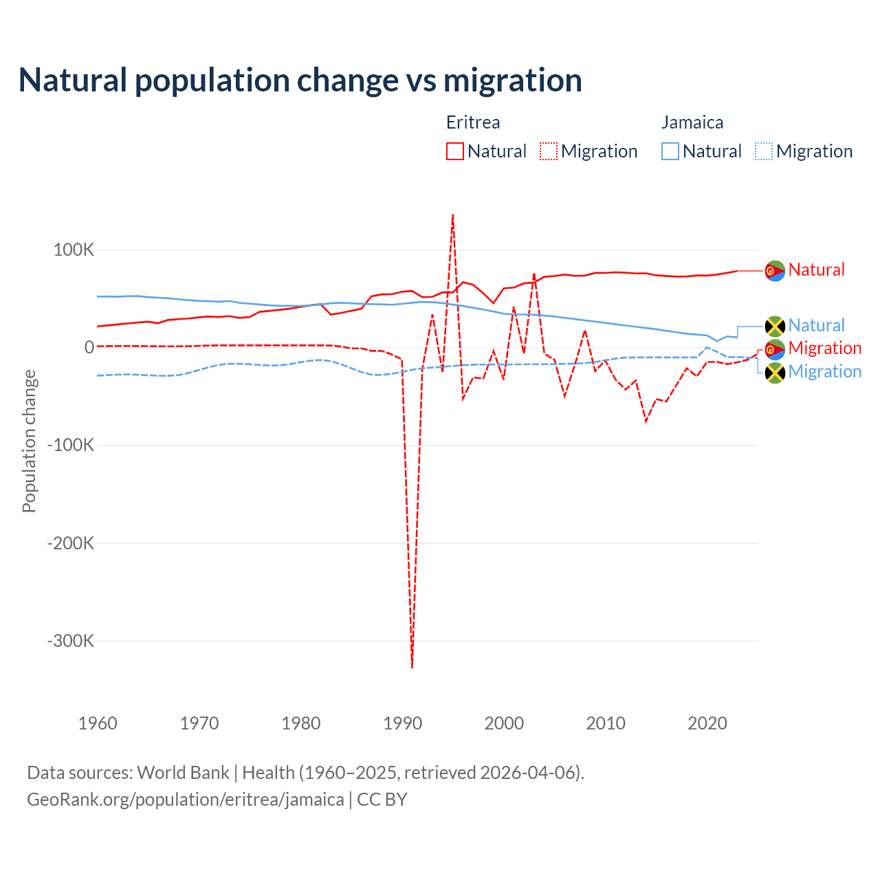 Over the last 10 years, 68.8% of the population change in Eritrea is from natural causes (a gain of 742,837 people) and 31.2% is from migration (a loss of 336,243 people). In Jamaica 61.3% is from natural causes (a gain of 137,465 people) and 38.7% is from migration (a loss of 86,681 people).