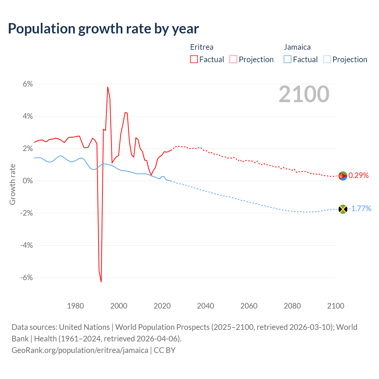 - For the last 10 years, Eritrea has had an average growth rate of +1.28% per year vs +0.18% in Jamaica.