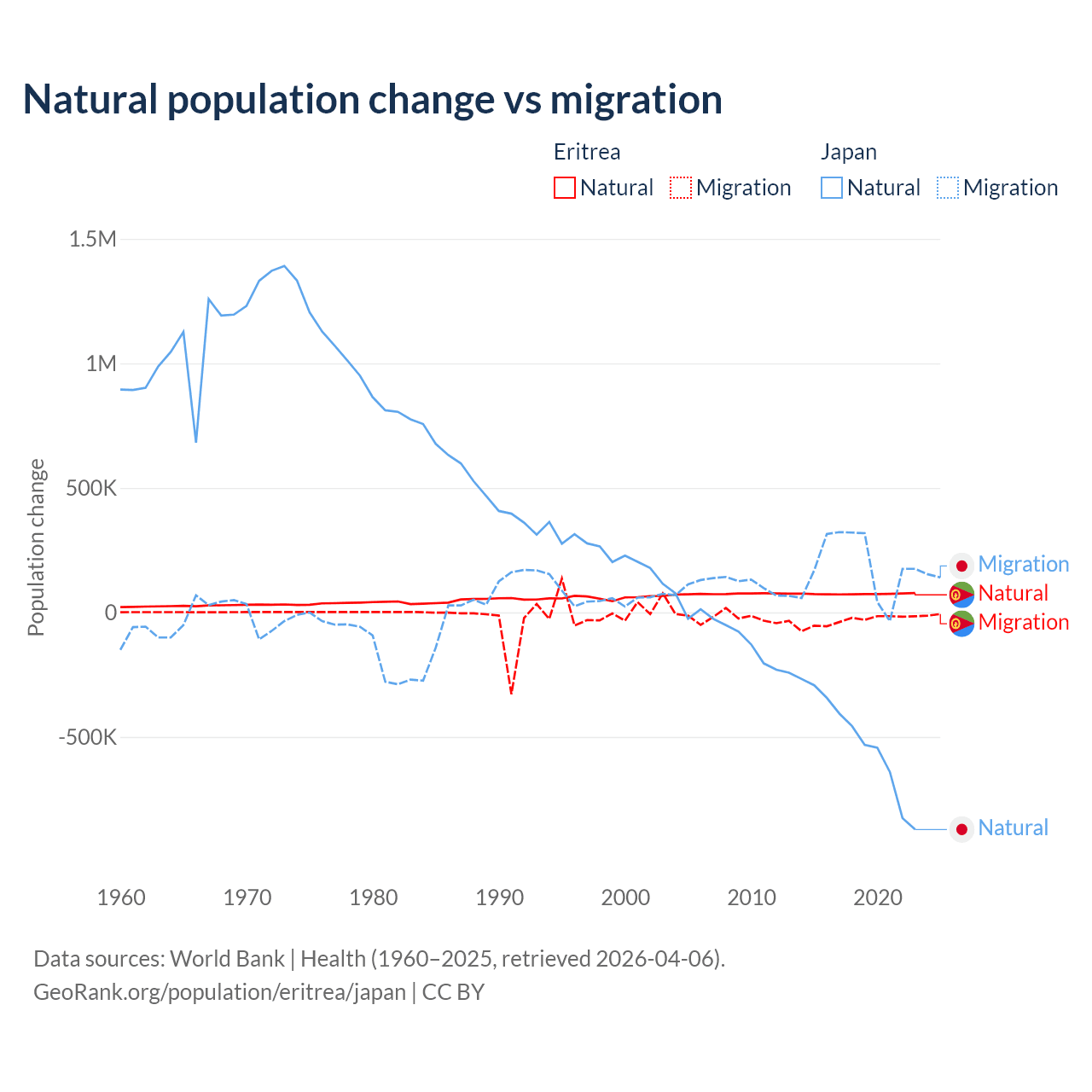 Over the last 10 years, 68.8% of the population change in Eritrea is from natural causes (a gain of 742,837 people) and 31.2% is from migration (a loss of 336,243 people). In Japan 73.6% is from natural causes (a loss of 5,178,838 people) and 26.4% is from migration (a gain of 1,860,103 people).