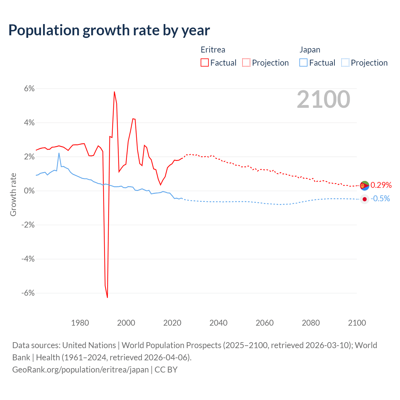 - For the last 10 years, Eritrea has had an average growth rate of +1.28% per year vs -0.25% in Japan.