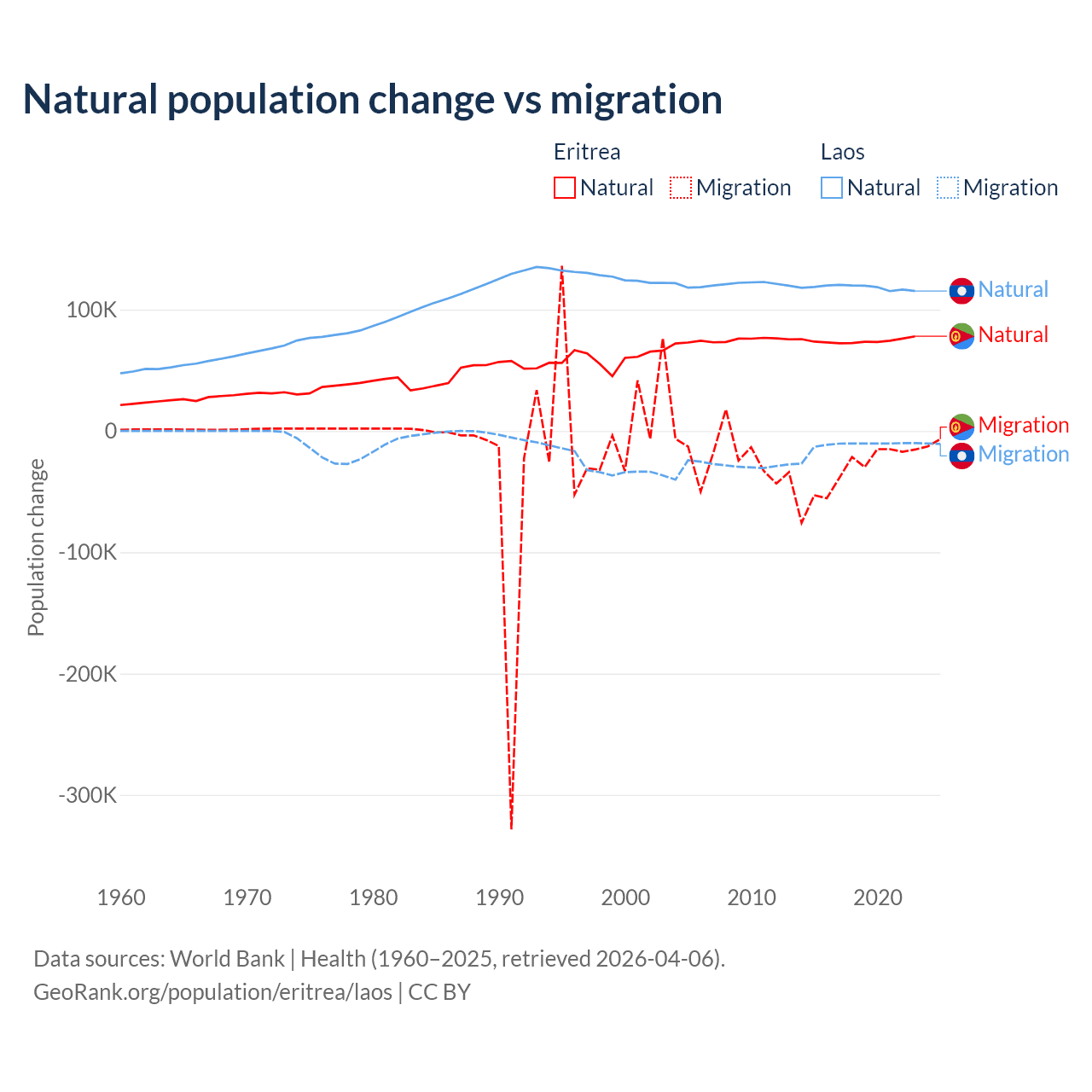 Over the last 10 years, 68.8% of the population change in Eritrea is from natural causes (a gain of 742,837 people) and 31.2% is from migration (a loss of 336,243 people). In Laos 90.6% is from natural causes (a gain of 1,183,013 people) and 9.41% is from migration (a loss of 122,899 people).