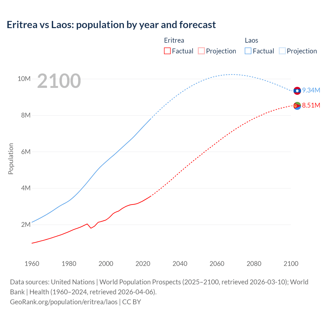 The latest officially reported population of Eritrea was 3,535,603 in 2024 vs 7,769,819 people in Laos in 2024. In 2026, based on the adjusted UN estimation, the current Eritrea's population is 3,700,586 people compared to 8,004,838 in Laos.