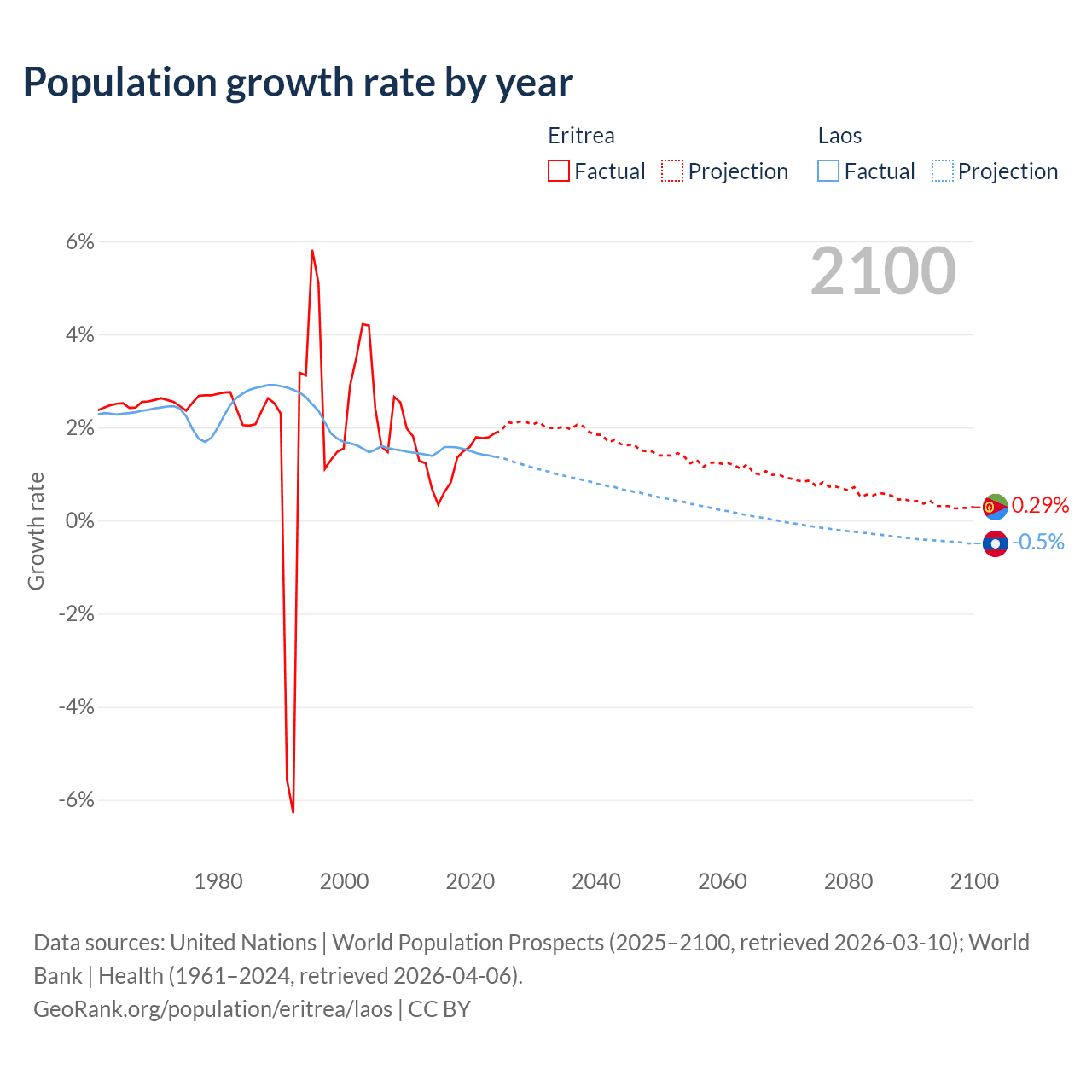 - For the last 10 years, Eritrea has had an average growth rate of +1.28% per year vs +1.48% in Laos.