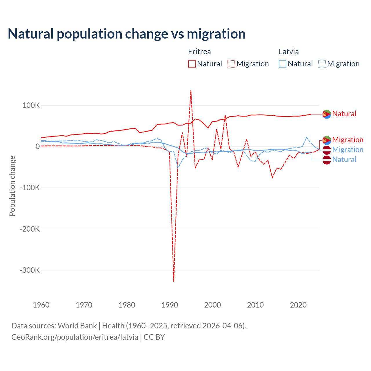 Over the last 10 years, 68.8% of the population change in Eritrea is from natural causes (a gain of 742,837 people) and 31.2% is from migration (a loss of 336,243 people). In Latvia 82.7% is from natural causes (a loss of 103,711 people) and 17.3% is from migration (a loss of 21,641 people).