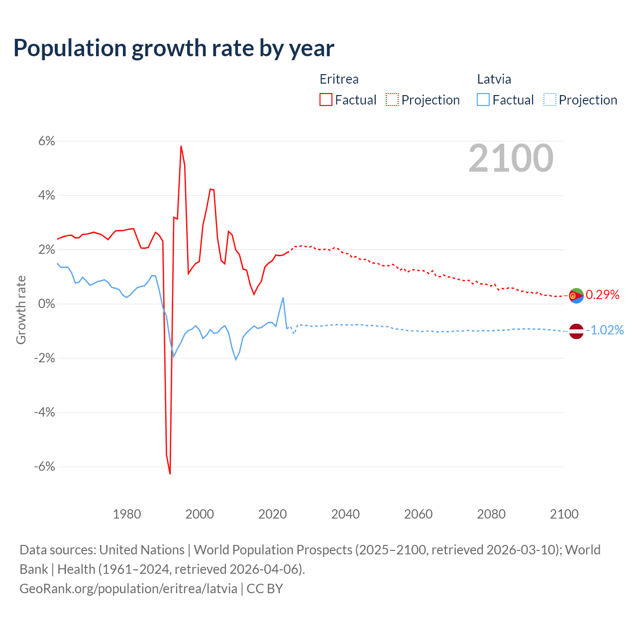 - For the last 10 years, Eritrea has had an average growth rate of +1.28% per year vs -0.68% in Latvia.