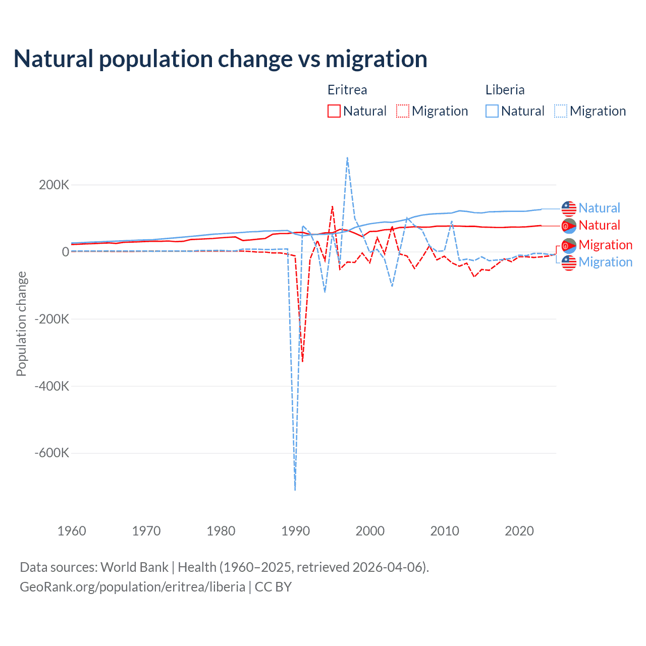 Over the last 10 years, 68.8% of the population change in Eritrea is from natural causes (a gain of 742,837 people) and 31.2% is from migration (a loss of 336,243 people). In Liberia 87.7% is from natural causes (a gain of 1,202,387 people) and 12.3% is from migration (a loss of 168,316 people).
