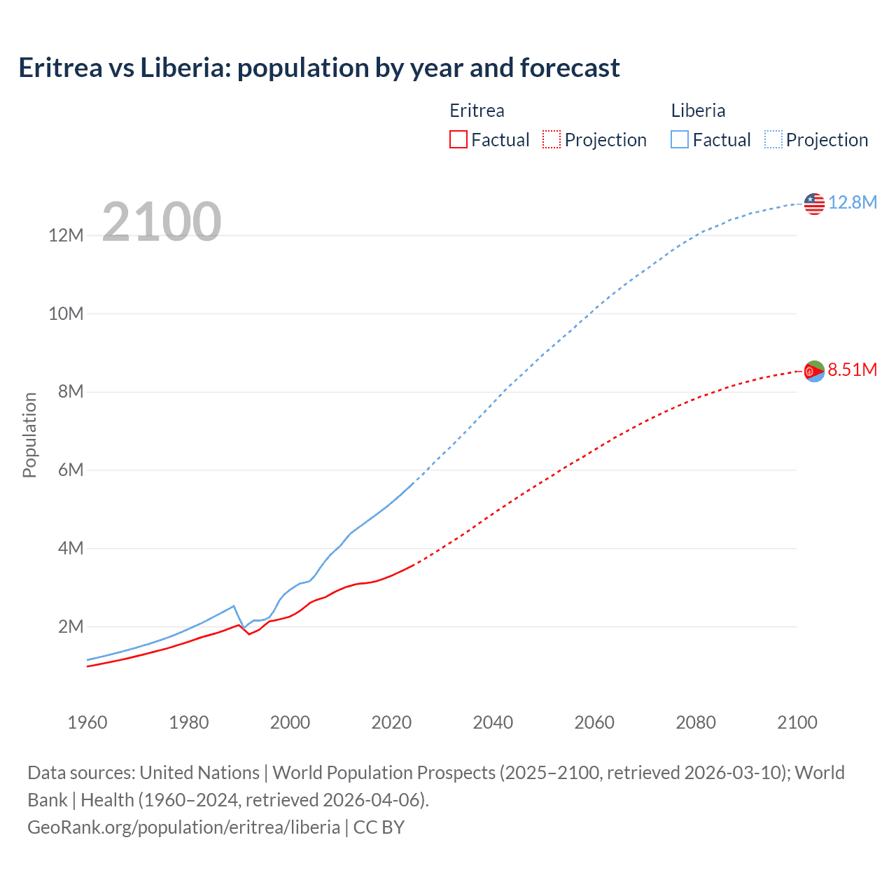 The latest officially reported population of Eritrea was 3,535,603 in 2024 vs 5,612,817 people in Liberia in 2024. In 2026, based on the adjusted UN estimation, the current Eritrea's population is 3,700,586 people compared to 5,887,000 in Liberia.