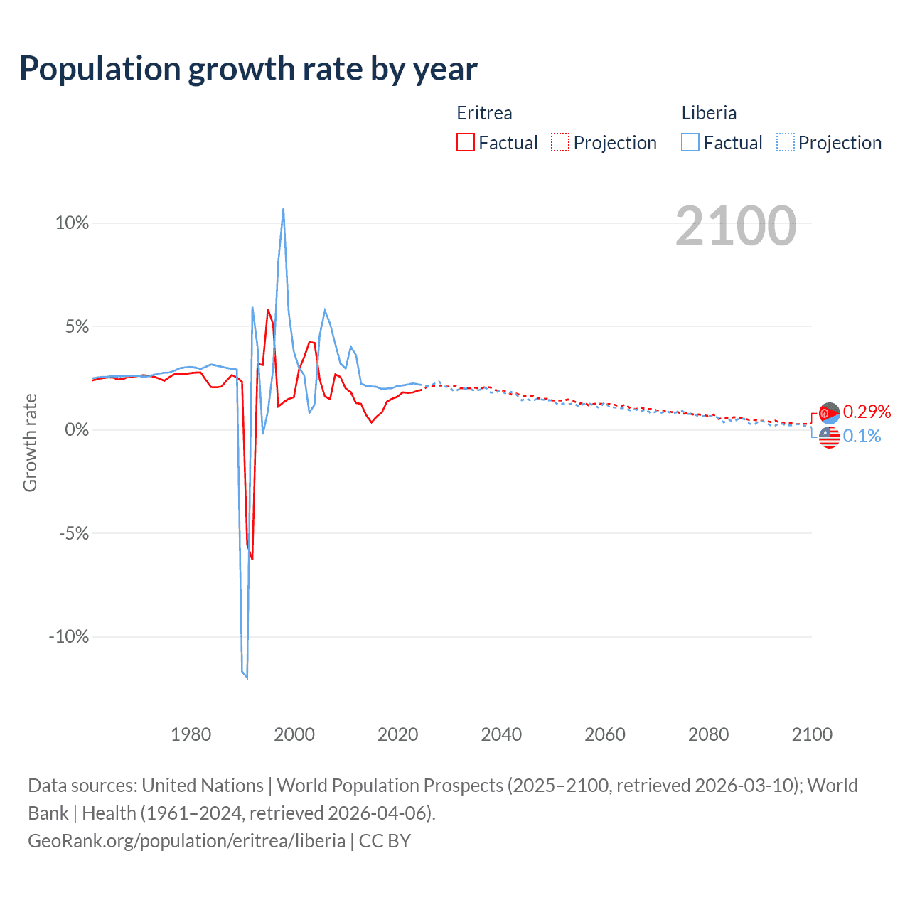 - For the last 10 years, Eritrea has had an average growth rate of +1.28% per year vs +2.09% in Liberia.