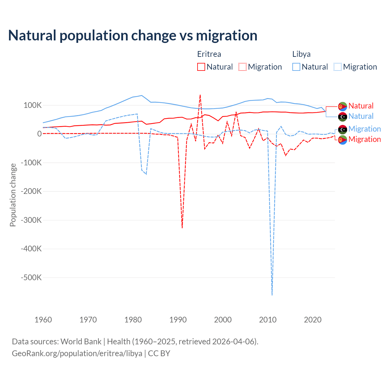 Over the last 10 years, 68.8% of the population change in Eritrea is from natural causes (a gain of 742,837 people) and 31.2% is from migration (a loss of 336,243 people). In Libya 99.4% is from natural causes (a gain of 975,799 people) and 0.63% is from migration (a loss of 6,150 people).
