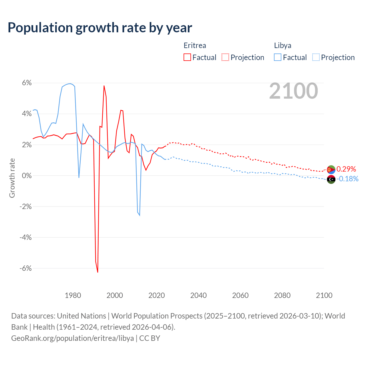 - For the last 10 years, Eritrea has had an average growth rate of +1.28% per year vs +1.44% in Libya.