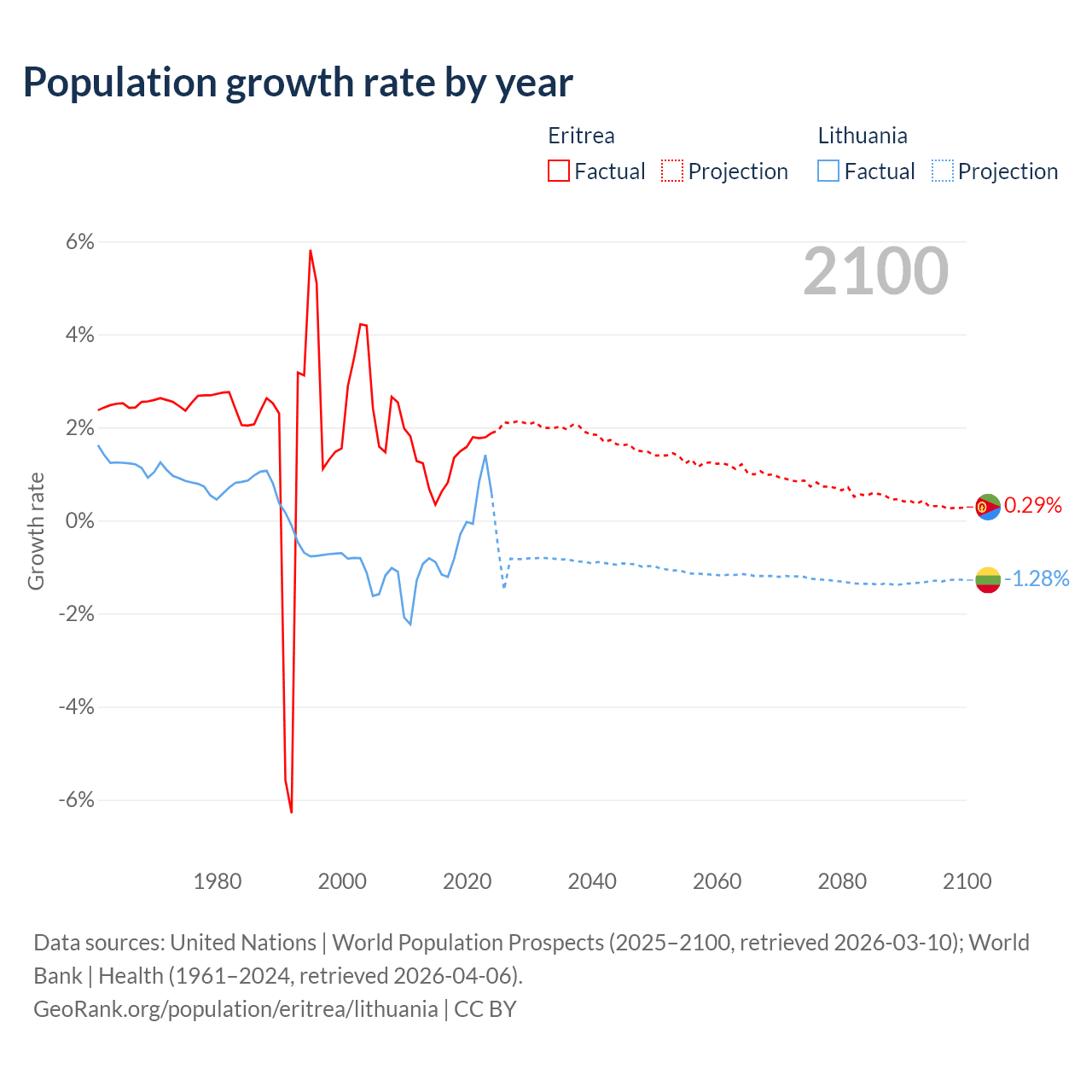 - For the last 10 years, Eritrea has had an average growth rate of +1.28% per year vs -0.22% in Lithuania.
