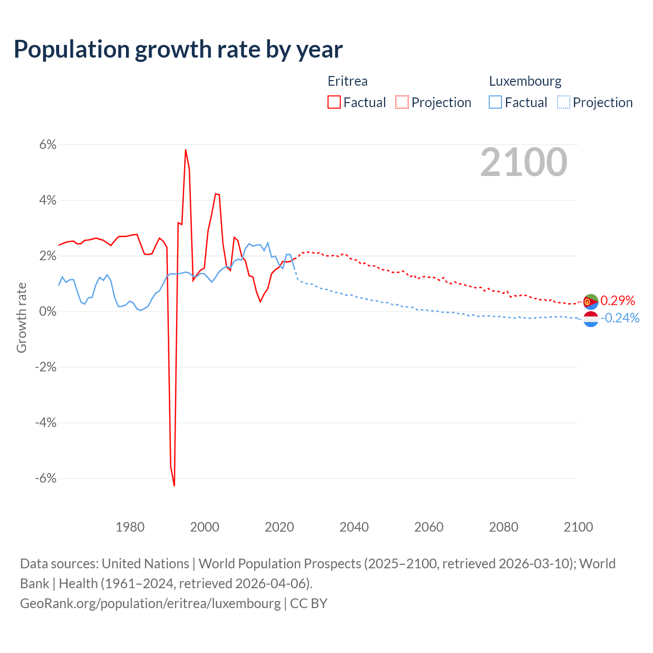 - For the last 10 years, Eritrea has had an average growth rate of +1.28% per year vs +2.02% in Luxembourg.
