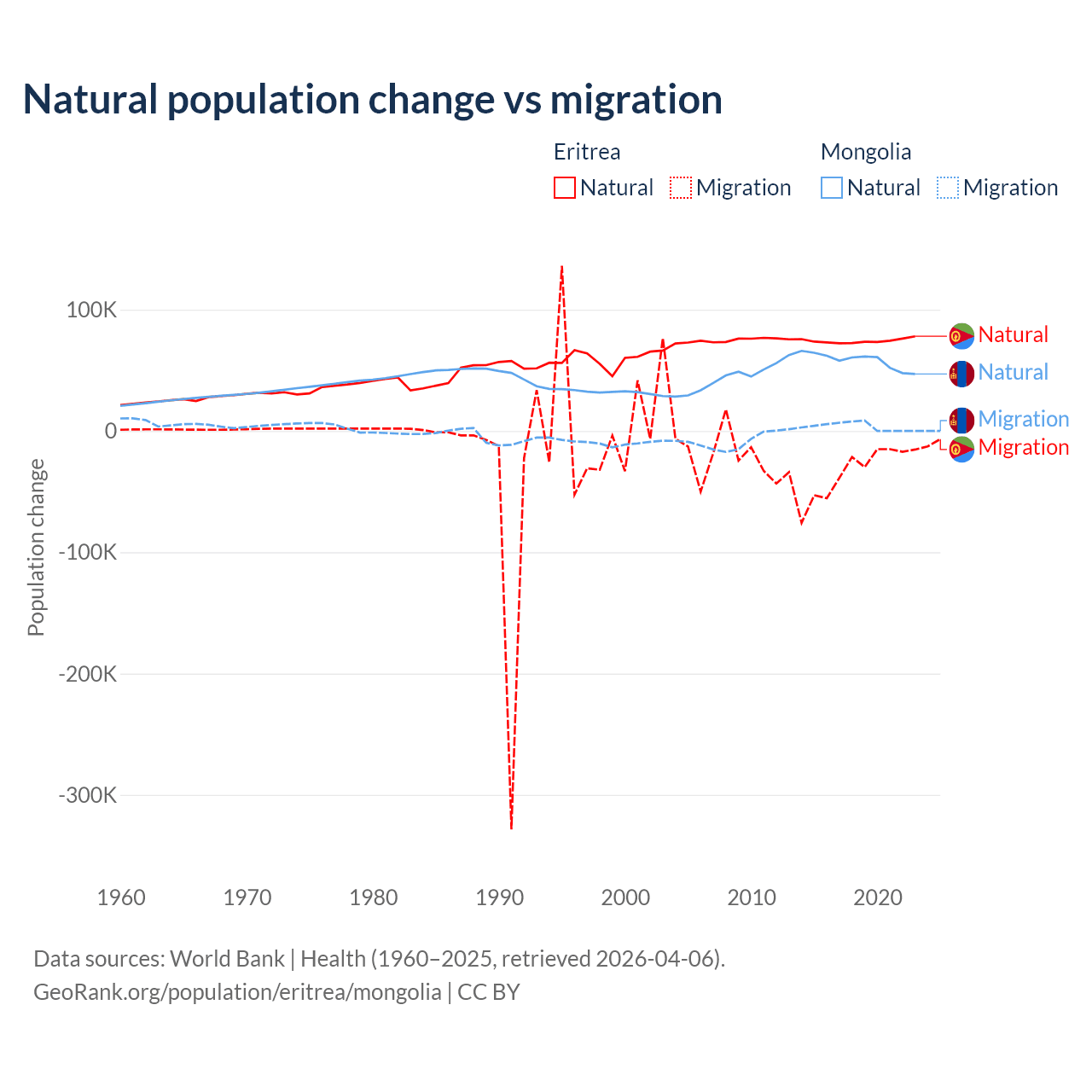 Over the last 10 years, 68.8% of the population change in Eritrea is from natural causes (a gain of 742,837 people) and 31.2% is from migration (a loss of 336,243 people). In Mongolia 94.1% is from natural causes (a gain of 580,367 people) and 5.87% is from migration (a gain of 36,163 people).